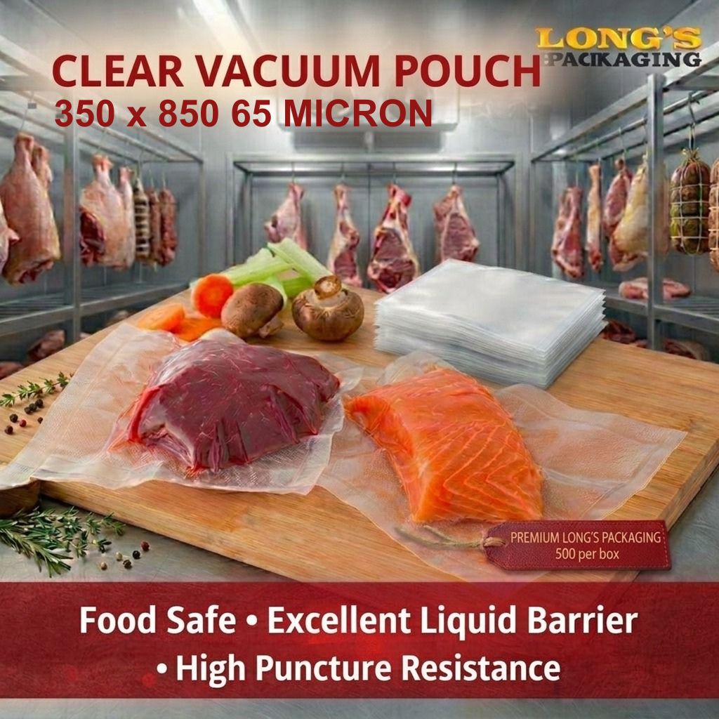 350 x 850 65 micron clear vacuum pouches that are made from food grade PA/PE coextruded multilayer flexible film.