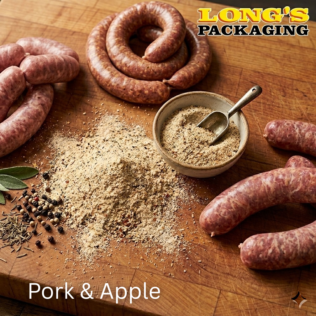 A delicious Pork & Apple Sausage Mix combining rich pork seasoning with the natural sweetness of apple for a perfectly balanced flavour. Ideal for creating juicy, flavourful sausages with a sweet and savoury profile. Perfect for butchers, catering, BBQs, and home sausage making.